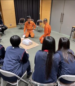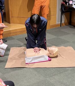 救急車が到着するまで8分ほどかかります。 胸骨圧迫は力がいるので、近くにいる人と交代で行っていき、絶え間なく行うことが大切と学びました。 また胸骨圧迫の際は強く押し、その分戻して心臓のポンプの役割を私たちが行っていく必要があると学びました。 次に異物の除去、怪我の対応、消化器の使い方について学びました。